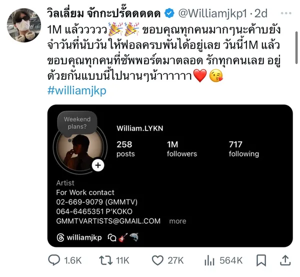 เรียกว่าเติมโตในเส้นทางบันเทิงได้สักพักสำหรับ “วิลเลี่ยม จักรภัทร แก้วพันธุ์พงษ์” หรือ “วิลเลี่ยม LYKN” ที่เจ้าตัวมีผลงานแจ้งเกิดจากซีรีส์ “เธมโป้ (ThamePo) HEART THAT SKIPS A BEAT” จากค่าย “GMMTV” เรียกว่าก็กลายเป็นหนุ่มที่มีแฟนคลับรอให้การตอบรับ พร้อมซัพพอร์ตกันแบบขั้นสุด ล่าสุดยังมีเรื่องน่ายินดีเพราะอินสตาแกรมของหนุ่ม "วิลเลี่ยม" ฮอตแรงมียอดผู้ติดตามสูงถึง 1 ล้านฟอลโลว์เป็นที่เรียบร้อย โดยเขาเองได้โพสต์ข้อความลงเป็น X ว่า “1M แล้ววววว ขอบคุณทุกคนมากๆนะค้าบยังจำวันที่นับวันให้ฟอลครบพันได้อยู่เลย วันนี้ 1M แล้วขอบคุณทุกคนที่ซัพพอร์ตมาตลอด รักทุกคนเลย อยู่ด้วยกันแบบนี้ไปนานๆน้าาาาาา #williamjkp”