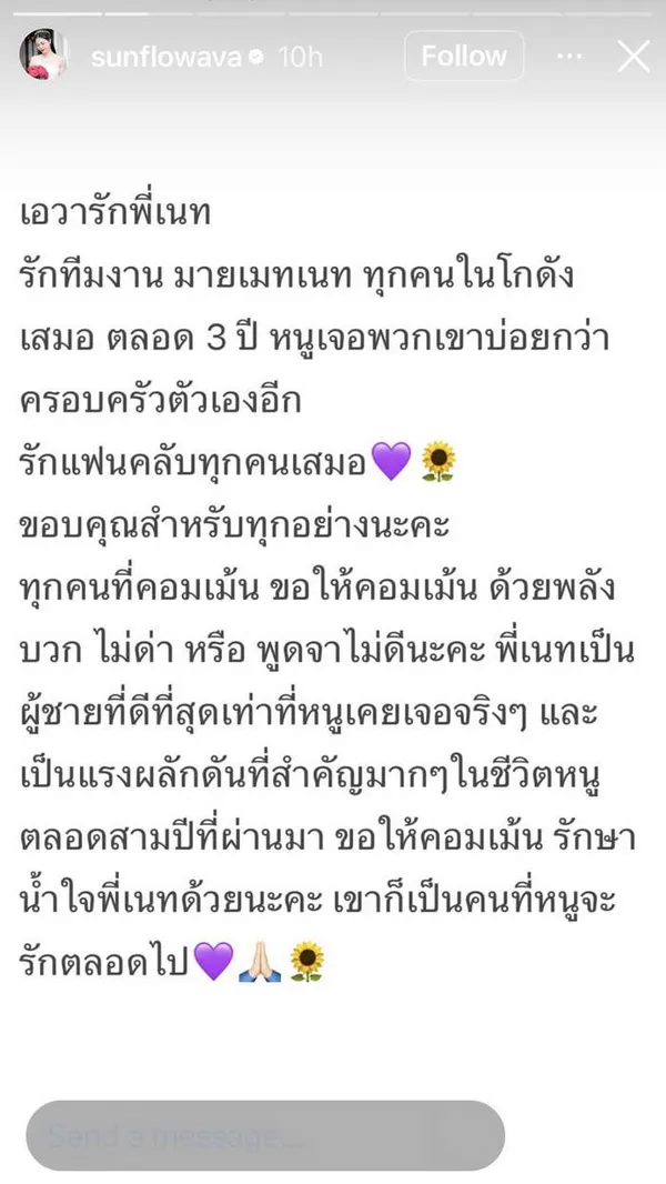 นอกจากนี้ เอวา ยังได้ลงสตอรี่ในอินสตาแกรม เผยความรู้สึกว่า "เอวารักพี่เนท รักทีมงาน มายเมทเนท ทุกคนในโกดังเสมอ ตลอด 3 ปี หนูเจอพวกเขาบ่อยกว่าครอบครัวตัวเองอีก รักแฟนคลับทุกคนเสมอ ขอบคุรสำหรับทุกอย่างนะคะ ทุกคนที่คอมเมนต์ ขอให้คอมมเนต์ด้วยพลังบวก ไม่ด่า หรือ พูดจาไม่ดีนะคะ พี่เนทเป็นผู้ชายที่ดีที่สุดเท่าที่หนูเคยเจอจริงๆ และเป็นแรงผลักดันที่สำคัญมากๆในชีวิตหนูตลอดสามปีที่ผ่านมา ขอให้คอมเมนต์ รักษาน้ำใจพี่เนทด้วยนะคะ เขาก็เป็นคนที่หนูจะรักตลอดไป"