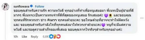 โดยที่ทางด้านของ เอวา ปวรวรรณ ก็เข้ามาคอมเมนต์ด้วยข้อความว่า "ขอบคุณสำหรับความรัก ความหวังดี ทุกอย่างที่ทำเพื่อหนูเสมอมา พี่เนทเป็นผู้ชายที่ดีมากๆ พี่เนทจะเป็นความทรงจำที่ดีที่สุดของหนูเสมอ รักเสมอค่ะ และขอบคุณทุกคนที่รักพวกเรา ชาว #เนวา ทุกคนด้วยนะคะ ขอโทษด้วยที่อาจจะทำให้ผิดหวัง และ ขอบคุณสำหรับกําลังใจที่ทุกคนส่งมาให้พวกเราด้วยนะคะหนูก็จะมีแต่ความหวังดี และรอดูความสำเร็จของพี่เสมอ ขอบคุณจากใจจริงๆสำหรับทุกอย่างค่ะ"