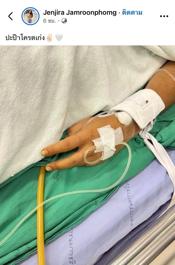 ในขณะที่ทางด้านของภรรยา ได้โพสต์ภาพหลังผ่าตัด ที่ ด้งเด้ง กำลังชู 2 นิ้ว เหมือนเป็นการส่งสัญญาณให้รับรู้ว่าพร้อมสู้ไม่ถอย