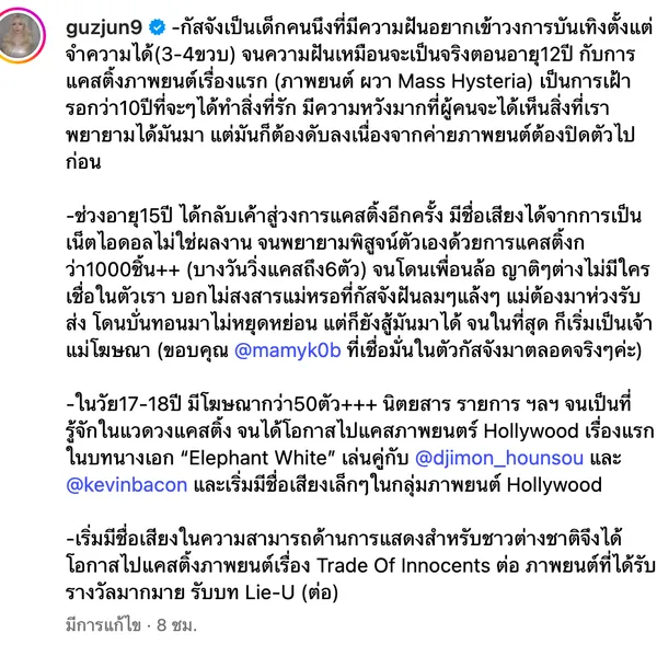 เป็นครั้งแรกที่กัสจังพูดยาวถึงชีวิตขนาดนี้ แต่อยากให้รู้จริงๆว่าทุกแรงสนับสนุนมีค่ากับกัสจังขนาดไหน กัสจังไม่ใช่คนพิมพ์หรือเขียนเก่ง อาจจะถนัดในการพูดคุยตรงไปตรงมา แต่ถ้าพูดเรื่องนี้คงจะยาว จึงขอพิมพ์ให้สั้นที่สุด(นี่สั้นแล้ว)นะคะ ท้ายที่สุดขอบคุณทุกแรงสนับสนุนจริงๆค่ะ มันมีค่าสำหรับกัสจังมากๆๆๆๆค่ะ" ภายหลังจากที่โพสต์ดังกล่าวถูกเผยแพร่ออกมาก็มีแฟนๆ เข้ามาคอมเมนต์ให้กำลังใจเธอเป็นจำนวนมาก
