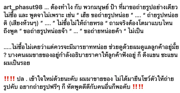 "ต้องทำไง กับ พวกมนุษย์ ป้า ที่มาขอถ่ายรูปอย่างเดียว ไม่ซื้อ และ พูดจาไม่เพราะ เช่น “ เฮ้ย ขอถ่ายรูปหน่อย ” …. “ ถ่ายรูปหน่อยดิ (เสียงห้วนๆ) ” …. ” ไม่ซื้อไม่ให้ถ่ายหรอ “ ถามจริงต้องโตมาแบบไหน ถึงพูด ” ขอถ่ายรูปหน่อยจ้า “ … ” ขอถ่ายหน่อยค้า “ ไม่เป็น ไม่ซื้อไม่เคยว่าแต่ควรจะมีมารยาทหน่อย ช่วยดูด้วยผมดูแลลูกค้าอยู่มั้ย ? บางคนผมขายของอยู่กำลังอธิบายราคาให้ลูกค้าฟังอยู่ ก็ ดึงแขน ซะแขนผมเป็นรอย ปล . เข้าใจใหม่ด้วยนะคับ ผมมาขายของ ไม่ได้มายืนโชว์ตัวให้ถ่ายรูปคับ อยากถ่ายรูปฟรีๆ ก็ หัดพูดดีดีกับคนอื่นก็พอคับ" หลังจากที่โพสต์ดังกล่าวถูกเผยแพร่ก็มีแฟนๆ เข้ามาให้กำลังใจเขาเป็นจำนวนมาก