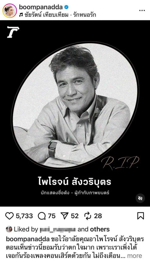 ในขณะที่อดีตนางงามและพิธีกรชื่อดังอย่าง บุ๋ม ปนัดดา วงศ์ผู้ดี ก็ได้ร่วมแสดงความอาลัยต่อการสูญเสียบุคคลสำคัญอีกหนึ่งคนของวงการบันเทิงไปว่า..