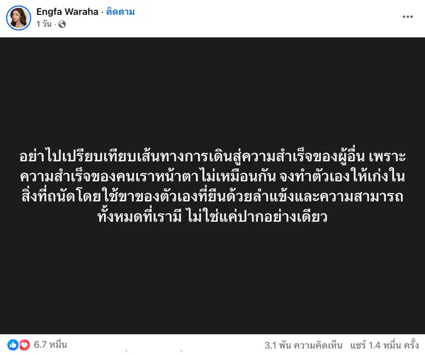 "อิงฟ้า วราหะ" โพสต์ดึงสติ อย่าไปเปรียบเทียบ ใช้ขาของตัวเองยืนด้วยลำแข้ง ไม่ใช่ปาก