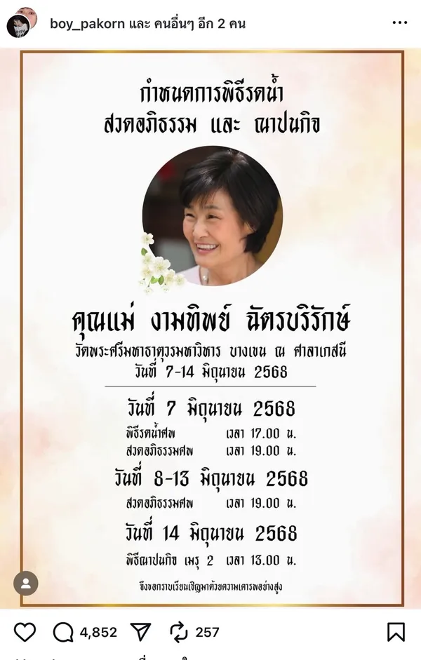 วันที่ 7 มิถุนายน 2568 — นักแสดงหนุ่มชื่อดัง “บอย” ปกรณ์ ฉัตรบริรักษ์ โพสต์แจ้งข่าวการสูญเสียครั้งใหญ่ในชีวิต โดย “คุณแม่งามทิพย์ ฉัตรบริรักษ์” ได้ถึงแก่กรรมอย่างสงบ ท่ามกลางความเศร้าโศกของครอบครัวและผู้ที่เคารพรัก