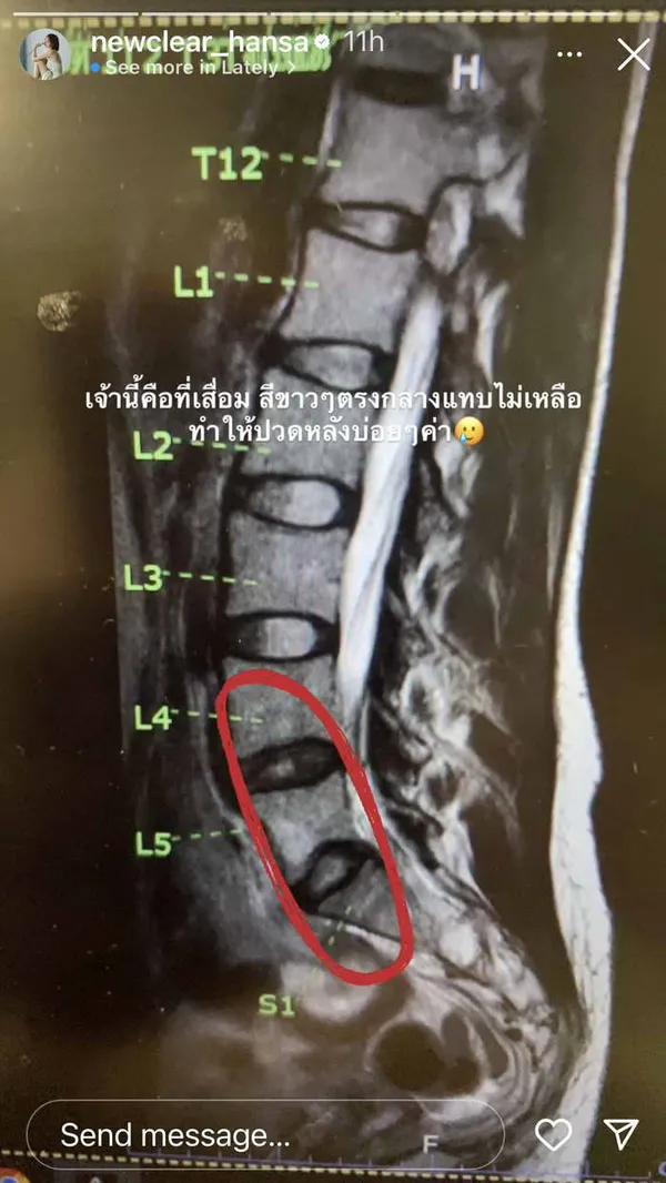 นอกจากนี้ยังได้เปิดภาพเอกซเรย์จุดที่เป็นปัญหา พร้อมระบุว่า "เจ้านี้คือที่สื่อม สีขาวๆตรงกลางแทบไม่เหลือ ทำให้ปวดหลังบ่อยๆค่า"