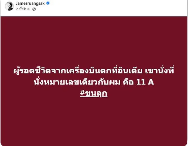 การที่ผู้รอดชีวิตเพียงคนเดียวจากโศกนาฏกรรมเครื่องบินตกครั้งล่าสุดที่อินเดีย จะนั่งอยู่บนที่นั่งหมายเลข 11A เหมือนกับประสบการณ์ของเจมส์ เรืองศักดิ์ ทำให้เกิดการตั้งข้อสังเกตถึงความบังเอิญที่เหลือเชื่อ และสร้างความประหลาดใจให้กับผู้ติดตามข่าวและแฟนคลับของเจมส์เป็นอย่างมาก หลายคนแสดงความคิดเห็นถึงความปาฏิหาริย์ที่เกิดขึ้นซ้ำสองในวาระที่แตกต่างกัน