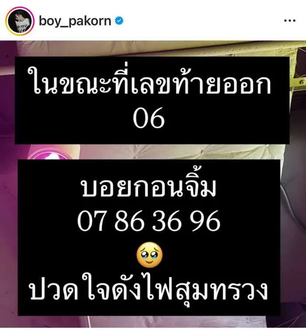 แล้ว หน่อง ธนา ก็เข้ามาตอบว่า แม่นั่งหัวเราะอยู่ข้างบน แม่บอกให้ตั้งใจทำงาน... นอกจากนี้ยังมีภาพที่ระบุข้อความว่า "ในขณะที่เลขท้ายออก 06 บอยกอนจิ้ม 07 86 36 96 ปวดใจดังไฟสุมทรวง เดี๋ยวเจอกัน เลขท้าย 3 ตัว"