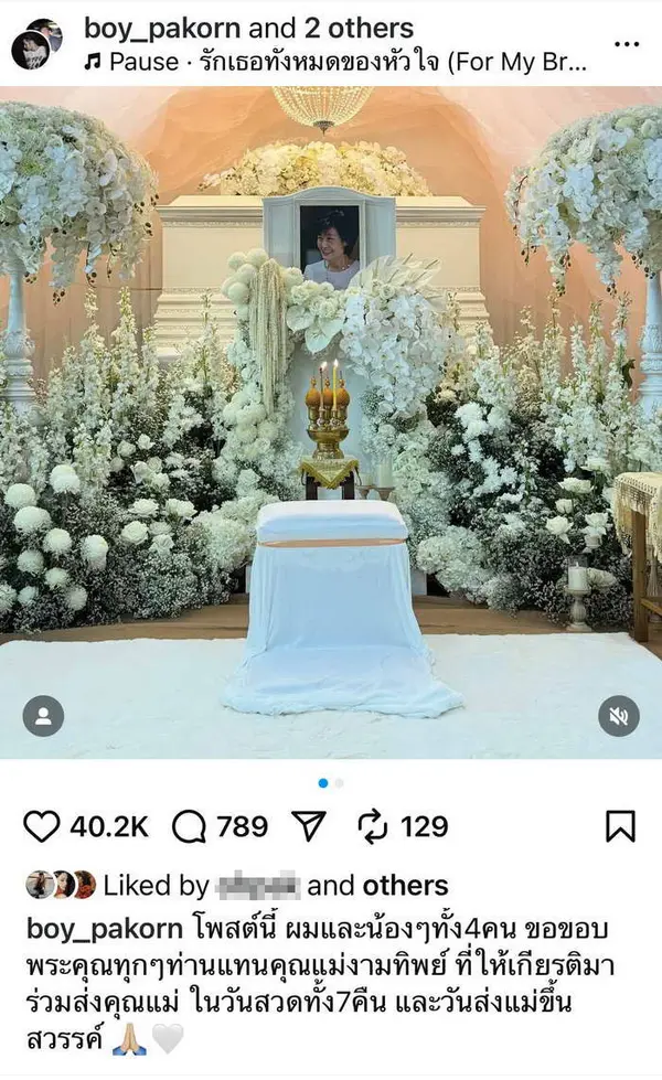 "โพสต์นี้ ผมและน้องๆทั้ง4คน ขอขอบพระคุณทุกๆท่านแทนคุณแม่งามทิพย์ ที่ให้เกียรติมาร่วมส่งคุณแม่ ในวันสวดทั้ง7คืน และวันส่งแม่ขึ้นสวรรค์