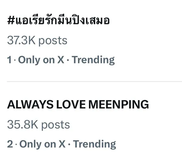 แฟนคลับยังเหนียวแน่น #แอเรียรักมีนปิงเสมอ พาฮอตขึ้นเทรนด์ X อันดับ 1 พร้อมเสิร์ฟโมเมนต์จิ้นและข้อความพลังบวกเต็มหน้าฟีด