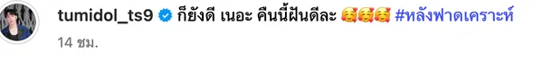 หลังจากที่เขาได้โพสต์ข้อความดังกล่าวพร้อมภาพลงในอินสตาแกรมส่วนตัว ก็มีแฟนๆ เข้ามาแสดงความยินดีกับหนุ่มตั้มเป็นจำนวนมาก พร้อมทั้งยังบอกว่าจากความโชคร้ายก่อนหน้านี้จะกลายเป็นเรื่องราวดีๆ อย่างแน่นอน