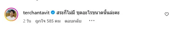 แต่ที่ทำเอาหลายคนอดแซวไม่ได้ ก็คือคอมเมนต์ของหวานใจอย่างพระเอกหนุ่ม "เต๋อ ฉันทวิชช์ ธนะเสวี" ที่เข้ามาแซวสั้นๆ แต่ได้ใจความว่า "สระก็ไม่มี ชุดอะไรขนาดนั้นล่ะคะ" สร้างความขบขันและเอ็นดูให้กับแฟนๆ ที่เห็นโมเมนต์น่ารักๆ ของทั้งคู่เป็นอย่างมาก โดยคอมเมนต์ที่แซวนั้นต่างเมนต์ไปในทิศทางเดียวกันว่า "ลุงเค้าหวง"