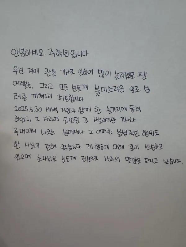 หลังจากตกเป็นข่าวใหญ่เกี่ยวกับประเด็นอื้อฉาวเรื่องการซื้อบริการทางเพศกับอดีตนักแสดง AV ชาวญี่ปุ่น ล่าสุด จูฮักนยอนอดีตสมาชิกวง THE BOYZ ได้ออกมาชี้แจงผ่านจดหมายขอโทษที่เขียนด้วยลายมือ เพื่อแสดงความรับผิดชอบและชี้แจงข้อเท็จจริงที่เกิดขึ้น