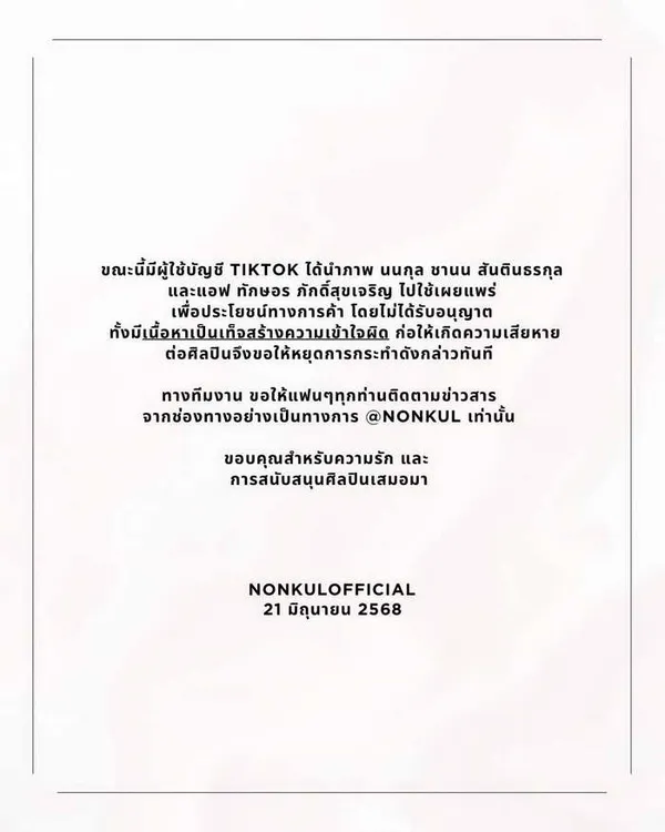 "ขณะนี้มีผู้ใช้บัญชี TikTok ได้นำภาพ นนกุล ชานน สันติธรกุล และ แอฟ ทักษอร ไปใช้เผยแพร่เพื่อประโยชน์ทางการค้า โดยไม่ได้รับอนุญาต