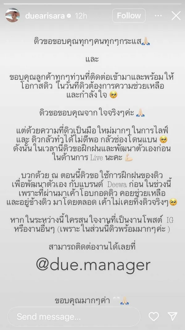 "ดิวขอขอบคุณทุกๆ คน ทุกๆ กระแส และขอบคุณลูกค้าทุกๆ ท่านที่ติดต่อเข้ามาและพร้อมให้โอกาสดิว ในวันที่ดิวต้องการความช่วยเหลือและกำลังใจ