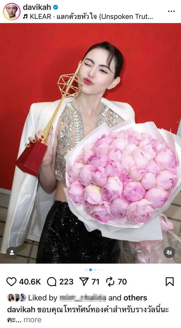 ซึ่งหลังจากรับรางวัล ใหม่ ดาวิกา ได้ออกมาโพสต์ข้อความแสดงความรู้สึกและความภาคภูมิใจผ่านอินสตาแกรมส่วนตัวว่า..