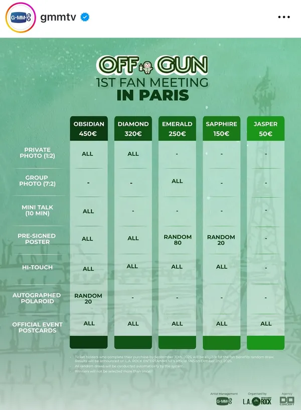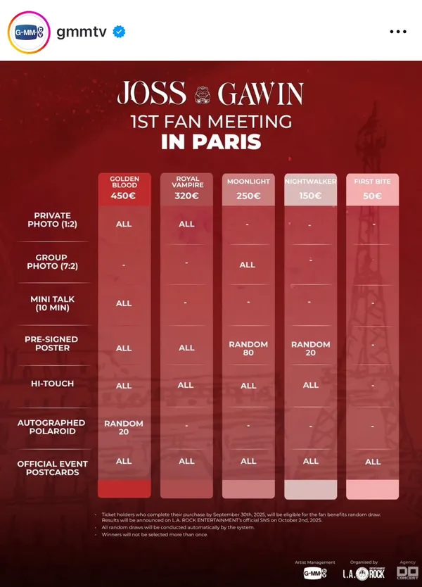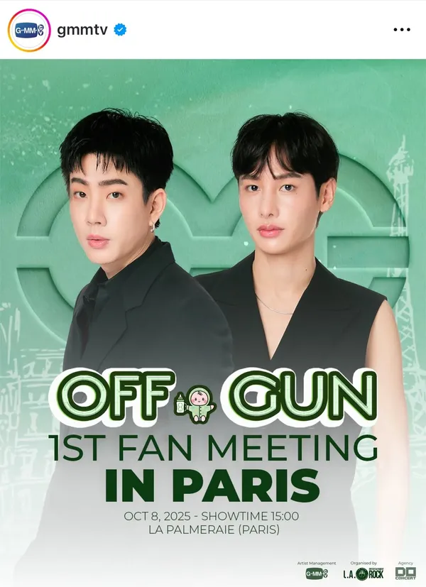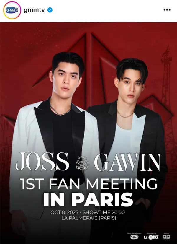 โดยงาน 1ST Fanmeeting in PARIS จะจัดขึ้นในวันที่ 8 ตุลาคม 2025 ที่ LA Palmeraie (PARIS) โดยรอบของ “ออฟ-กัน” จะเป็นเวลา 15:00 น. ตามเวลาท้องถิ่น และรอบของ “จอส-กวิน” เวลา 20:00 น. ในวันเดียวกัน มีการเปิดขายบัตรเริ่มในวันที่ 1 กรกฎาคม 2025 เวลา 13:00 น. เชื่อว่างานนี้คงได้เห็นเซอร์ไพรส์จากทั้ง 4 หนุ่มสุดฟินอย่างแน่นอน