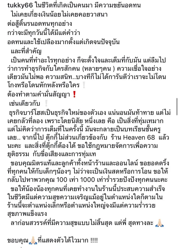 จากนี้ไป ตุ๊กกี้ไม่ส่วนเกี่ยวข้องกับ ร้าน Heaven 68 แล้วนะคะ และสิ่งที่ตุ๊กกี้ต้องได้ ขอใช้กฎหมายจัดการเพื่อความยุติธรรม กับขื่อเสียงและการทุ่มเท ขอบคุณมิตรแท้และลูกค้าทั้งหน้าร้านและออนไลน์ ขอยอดดริ้งที่ทุกคนให้กับเด็กๆน้องๆ ไม่ว่าจะเป็นเงินสดหรือการโอน ขอให้กลับไปหาพวกคุณ 100 เท่า 1000 เท่าร่ำรวยปังปังทุกคนนะคะ ขอให้น้องน้องทุกคนที่เคยทำงานในร้านนี้ประสบความสำเร็จในชีวิตมีแต่ความสุขความเจริญแม้อยู่ในตำแหน่งใดก็ตามในร้านนี้จะตำแหน่งเล็กหรื ตำแหน่งใหญ่จงมีแต่ความร่ำรวยสุขภาพแข็งแรง ลาก่อนสวรรค์ที่มีความสุขแบบไม่สิ้นสุด แต่พี่ สุดทางละ ขอบคุณที่แสดงตัวได้ไวมาก" โดยภายหลังจากที่โพสต์ดังกล่าวได้ถูกเผยแพร่ออกไปก็มีแฟนๆ เข้ามาคอมเมนต์แสดงความเห็น พร้อมทั้งให้กำลังใจเธอเป็นจำนวนมาก