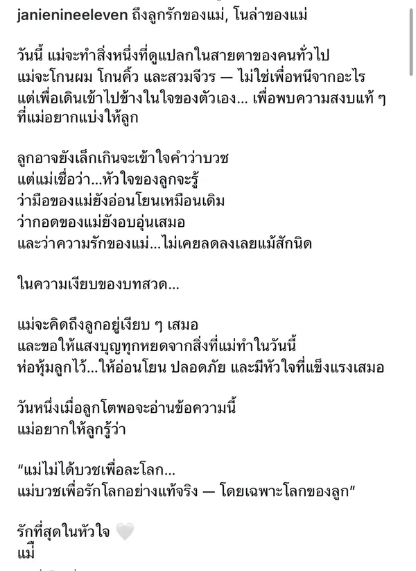 ในความเงียบของบทสวด… แม่จะคิดถึงลูกอยู่เงียบ ๆ เสมอ และขอให้แสงบุญทุกหยดจากสิ่งที่แม่ทำในวันนี้ ห่อหุ้มลูกไว้…ให้อ่อนโยน ปลอดภัย และมีหัวใจที่แข็งแรงเสมอ วันหนึ่งเมื่อลูกโตพอจะอ่านข้อความนี้ แม่อยากให้ลูกรู้ว่า “แม่ไม่ได้บวชเพื่อละโลก… แม่บวชเพื่อรักโลกอย่างแท้จริง — โดยเฉพาะโลกของลูก” รักที่สุดในหัวใจ แม่"