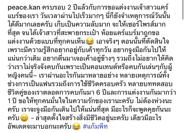 ตอนนั้นที่ตัดสินใจเพราะมีความรู้สึกอยากอยู่กับเค้าทุกวัน อยากจูงมือกันไปให้แน่นกว่าเดิม อยากตื่นมาเจอเค้าอยู่ข้างๆ รวมถึงไม่อยากให้คิดว่าเราไม่จริงจังคบกันเพราะเป็นคอนเทนต์หรือคบกันเล่นๆกับผู้หญิงคนนี้~ เราผ่านอะไรกันมาหลายอย่าง หลายเหตุการณ์ทั้งช่วงการเป็นแฟนรวมถึงการใช้ชีวิตครอบครัว หลายบททดสอบชีวิตคู่ของเราตลอดการคบกันมา 6 ปีและการแต่งงานกันมากว่า 1 ปี ขอให้ทุกคนมั่นใจในความรักของเรานะครับ ไม่ต้องห่วงนะครับ เราจะจูงมือกันเดินไปให้แน่นที่สุด มีอะไรก็จะพูดคุยกันนะครับ - ล่าสุดตั้งใจสร้างสิ่งมีชีวิตอยู่นะครับ เดียวมีอะไรอัพเดตจะมาบอกนะครับ #แก้มพีท" โดยหลังจากนั้นมีแฟนๆ เข้ามาคอมเมนต์ยินดีเป็นจำนวนมาก