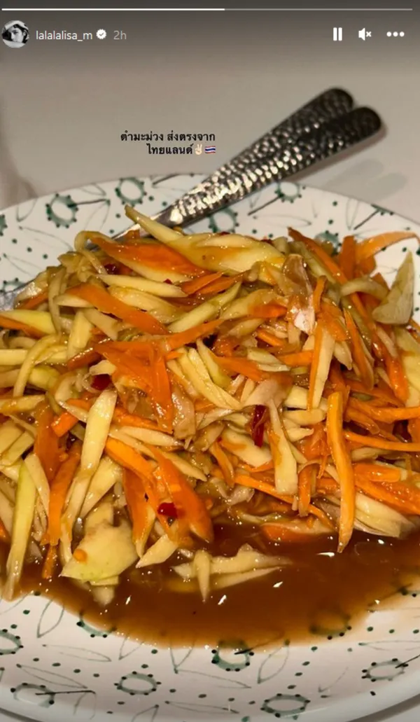มาที่เมนู "ตำมะม่วง" ที่เธอเองแม้ว่าจะต้องทำงานอยู่ในประเทศเกาหลี และเดินทางไปยังหลายประเทศทั่วโลกก็ไม่พลาดที่จะมีอาหารแซ่บๆ อย่างตำมะม่วงส่งตรงไปให้ทาน โดยครั้งหนึ่งเธอได้โพสต์ภาพตำมะม่วง พร้อมทั้งเขียนข้อความว่า "ตำมะม่วง ส่งตรงจากไทยแลนด์" ทำเอาแฟนๆ เปรี้ยวปากต้องไปหาตำมะม่วงมาทานเหมือนสาว "ลิซ่า"