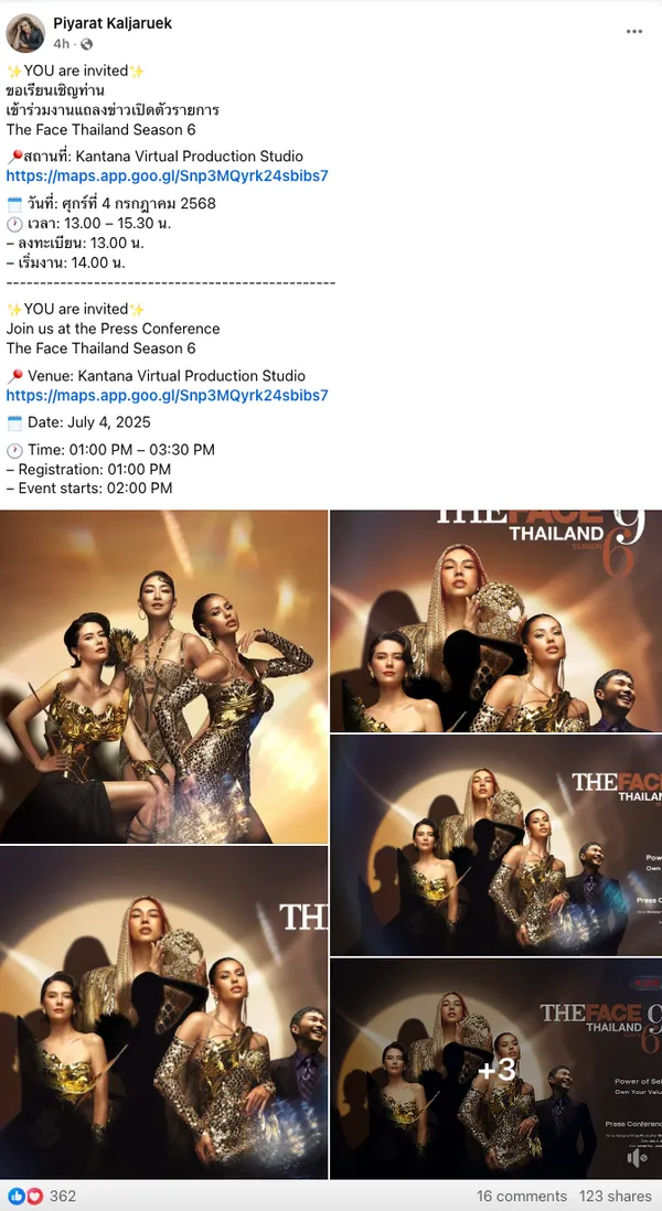 เป็นอีกหนึ่งรายการที่มีแฟนๆ รอให้การติดตามเป็นจำนวนมากสำหรับ The Face Thailand Season 6 ที่ทางเพจของรายการก็ได้ค่อยๆ เปิดตัวเมนเทอร์ทีละคนซึ่งก่อนหน้านี้ได้เฉลยว่าเป็นสาว "แอนโทเนีย" และ "มารีญา พูลเลิศลาภ" ทำเอาแฟนๆ ลุ้นว่าใครจะเป็นอีกหนึ่งเมนเทอร์ ล่าสุดทางด้านผู้จัดรายการอย่าง "เต้ ปิยะรัฐ" หรือ "เต้ กันตนา" ได้ออกมาโพสต์ภาพเฉลยลงบนเฟสบุ๊คส่วนตัวของเขา Piyarat Kaljaruek โดยได้มีการเปลี่ยนภาพ cover photo ใหม่ พร้อมทั้งใส่รายละเอียดในโพสต์ว่า "YOU are invited ขอเรียนเชิญท่าน เข้าร่วมงานแถลงข่าวเปิดตัวรายการ The Face Thailand Season 6" โดยเป็นการเชิญเข้าร่วมงานเปิดตัวสุดยิ่งใหญ่ของรายการ