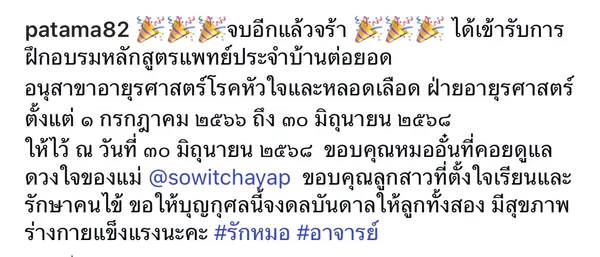 เรียกว่าเป็นเรื่องน่ายินดีของคนเป็นแม่สำหรับ "ดี้ ปัทมา" ที่ล่าสุดลูกสาวคนสวยได้เป็นแพทย์หญิงพลอย โสวิชญา ปานทอง แพทย์อายุรศาสตร์โรคหัวใจและหลอดเลือด เธอเรียนอยู่ที่โรงพยาบาลจุฬาลงกรณ์ สภากาชาดไทย โดยเธอได้โพสต์ภาพลูกสาว พร้อมทั้งแคปชั่นว่า "จบอีกแล้วจร้า ได้เข้ารับการฝึกอบรมหลักสูตรแพทย์ประจำบ้านต่อยอด อนุสาขาอายุรศาสตร์โรคหัวใจและหลอดเลือด ฝ่ายอายุรศาสตร์ ตั้งแต่ ๑ กรกฎาคม ๒๕๖๖ ถึง ๓๐ มิถุนายน ๒๕๖๘ ให้ไว้ ณ วันที่ ๓๐ มิถุนายน ๒๕๖๘ ขอบคุณหมออั๋นที่คอยดูแลดวงใจของแม่ @sowitchayap ขอบคุณลูกสาวที่ตั้งใจเรียนและรักษาคนไข้ ขอให้บุญกุศลนี้จงดลบันดาลให้ลูกทั้งสอง มีสุขภาพร่างกายแข็งแรงนะคะ #รักหมอ #อาจารย์."