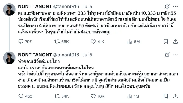 หลังจากนั้นไม่นานเขาได้โพสต์ต่อว่า “ผมและทีมงานพยายามคิดราคา 333 ให้ทุกคน ก็ยังมีคนมาอัพเป็น 10,333 บาทอีก 55 น้องเด็กนักเรียนก็ร้องไห้กัน ละคือนนท์เห็นราคาบัตรผี resale อีก นนท์ไม่ชอบใจ ก็เลยจะเปิดรอบ 4 ตัดราคาตลาดเอง 555 คิดซะว่ามาร้องเพลงด้วยกัน แต่ไม่เพิ่มรอบกว่านี้แล้วนะเพื่อนๆ ในรุ่นเค้าก็ไม่ทำกัน 4 รอบ กลัวจะตุย”