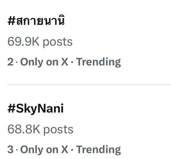 ไม่เพียงเท่านั้นแฟนๆ ยังแห่แชร์ภาพไปใน X ทำให้ชื่อขอ #สกายนานิ #SkyNani ติดเทรนด์ในทันทีเช้าวันนี้ (7 กรกฏาคม) กลายเป็นอีกหนึ่งคู่นักแสดงหนุ่มที่มีแฟนๆ รอให้การตอบรับเป็นอย่างดี ด้วยความที่เคมีของทั้งสองนั้นลงตัว พร้อมทั้งโมเมนต์ที่มีให้ได้ติดตามกันอยู่ตลอด ไม่แปลกใจที่ทั้งสองหนุ่มจะกลายเป็นขวัญใจใครหลายๆ คนเชื่อว่าหลังจากนี้คงจะได้เห็นผลงานของทั้งสองออกมาให้แฟนๆ ได้ติดตามกันอย่างต่อเนื่อง