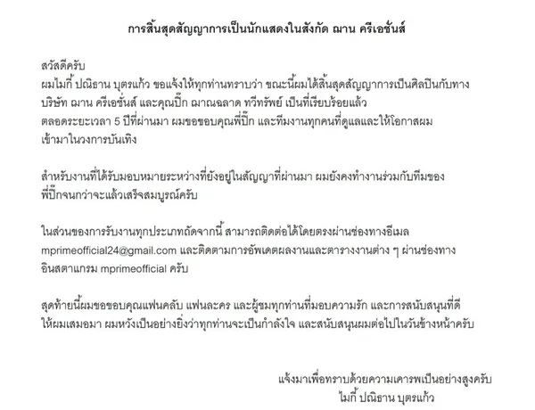 ในส่วนของการรับงานทุกประเภทถัดจากนี้ สามารถติดต่อได้โดยตรงผ่านช่องทางอีเมล [email protected] และติดตามการอัพเดตผลงานและตารางงานต่าง ๆ ผ่านช่องทาง อินสตาแกรม mprimeofficial ครับ สุดท้ายนี้ผมขอขอบคุณแฟนคลับ แฟนละคร และผู้ชมทุกท่านที่มอบความรัก และการสนับสนุนที่ดี ให้ผมเสมอมา ผมหวังเป็นอย่างยิ่งว่าทุกท่านจะเป็นกําลังใจ และสนับสนุนผมต่อไปในวันข้างหน้าครับ