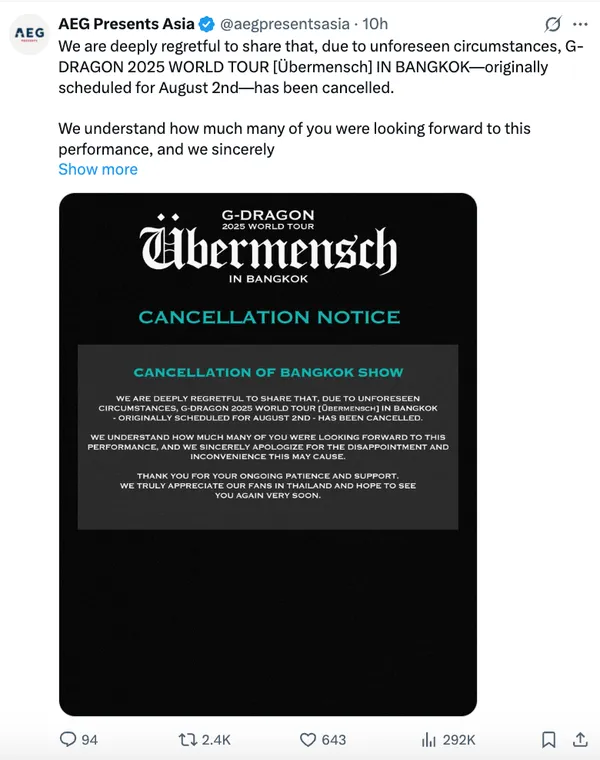 เรียกว่าก่อนหน้านี้ ทางด้านศิลปินหนุ่มสุดฮอตจากเกาหลีใต้อย่าง “G-Dragon” ได้ประกาศเวิลด์ทัวร์คอนเสิร์ตเดี่ยว 2025 ทัวร์ครั้งใหม่นี้ใช้ชื่อว่า “G-DRAGON 2025 WORLD TOUR (Übermensch)” โดยในลิสต์ก็มีประเทศไทยเป็นหนึ่งในลิสต์ตารางเฟส 2 โดยหลังจากนั้นก็ได้มีประกาศเลื่อนอย่างไม่มีกำหนด เนื่องจากมีคำเตือนเรื่องสภาพอากาศ จนทีมงานเตรียมหาวันจัดใหม่อีกครั้ง แต่ล่าสุดทางด้าน AEG Presents Asia โปรโมเตอร์คอนเสิร์ต ผู้จัดงานคอนเสิร์ตในครั้งนี้อย่างเป็นทางการได้ออกมาประกาศผ่าน X โดยชี้แจงว่ามีเหตุสุดวิสัยให้มีความจำเป็นต้องยกเลิกคอนเสิร์ต “G-DRAGON 2025 WORLD TOUR [ÜBERMENSCH] IN BANGKOK” ที่มีกำหนดแสดงในวันที่ 2 สิงหาคมในประเทศไทย