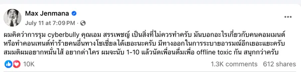 "แม็กซ์ เจนมานะ" โพสต์เฟสบุ๊คส่วนตัว ออกโรงป้อง ไม่เห็นด้วย หลัง "เอม สรรเพชญ์" ปมถูกบูลลี่พากย์เสียง Superman