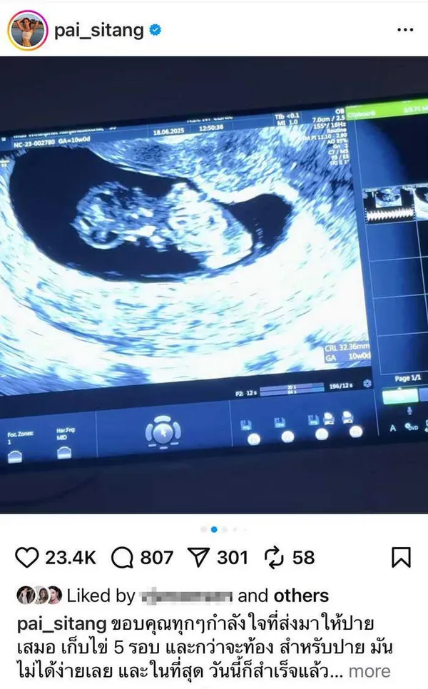 โดยที่สาว ปาย สิตางศุ์ ได้โพสต์อวดภาพอัลตร้าซาวด์ พร้อมข้อความว่า "ขอบคุณทุกๆกำลังใจที่ส่งมาให้ปายเสมอ เก็บไข่ 5 รอบ และกว่าจะท้อง สำหรับปาย มันไม่ได้ง่ายเลย และในที่สุด วันนี้ก็สำเร็จแล้วค่า ปายจะพยายามแบ่งปันความรู้และสิ่งดีๆที่กว่าปายจะผ่านมาได้ อยากให้ทุกคนรอติดตามนะคะ ปายมีภาวะไข่แก่ ถึงจะมีไข่ แต่ไข่ปายไม่มีคุณภาพ กว่าจะได้ไข่ที่แข็งแรงมันไม่ง่ายเลย"