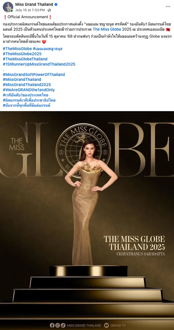 ทำเอาแฟนนางงามได้เฮอีกครั้งหลังจากที่กอง Miss Grand Thailand ได้โพสต์แต่งตั้ง “เฌอเอม ชญาธนุส ศรทัตต์” รองอันดับ1 มิสแกรนด์ไทยแลนด์ 2025 ที่ล่าสุดกองประกวด Miss Grand Thailand เป็นตัวแทนประเทศไทยไปประกวดเวทีระดับโลก The Miss Globe 2025 ณ ประเทศแอลเบเนีย โดยมีเนื้อหาว่า “กองประกวดมิสแกรนด์ไทยแลนด์ขอประกาศแต่งตั้ง “เฌอเอม ชญาธนุส ศรทัตต์” รองอันดับ 1 มิสแกรนด์ไทยแลนด์ 2025 เป็นตัวแทนประเทศไทยเข้าร่วมการประกวด The Miss Globe 2025 ณ ประเทศเอลเบเนีย โดยรอบตัดสินจะมีขึ้นในวันที่ 15 ตุลาคม '68 ฝากแฟนๆ ร่วมเป็นกำลังใจให้เฌอเอมคว้ามงกุฎ Globe มงแรกมาฝากคนไทย ด้วยนะคะ”