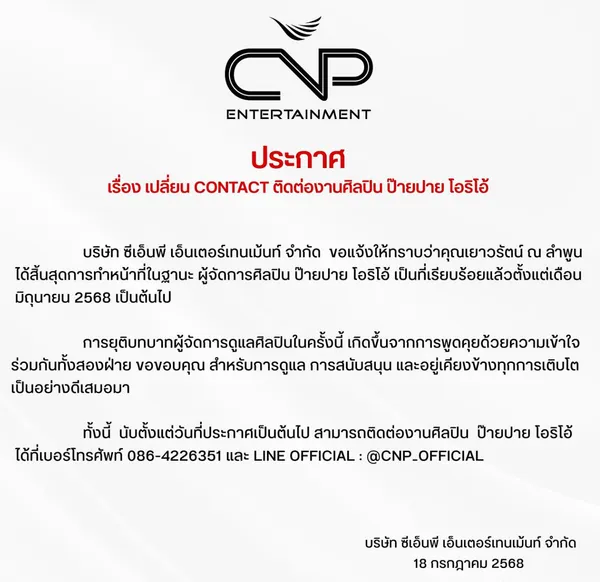 ทำเอาแฟนๆ แอบตกใจอยู่ไม่น้อยสำหรับศิลปินสุดฮอต “ป๊ายปาย โอริโอ้” ที่ล่าสุดทางต้นสังกัดอย่าง บริษัท ซีเอ็นพี เอ็นเตอร์เทนเม้นท์ จำกัด ได้ออกมาประกาศเปลี่ยน CONTACT ติดต่องานศิลปินดัง โดยมีเนื้อความในจดหมายระบุไว้ว่า “ประกาศเรื่อง เปลี่ยน CONTACT ติดต่องานศิลปิน ป๊ายปาย โอริโอ้ บริษัท ซีเอ็นพี่ เอ็นเตอร์เทนเม้นท์ จำกัด ขอแจ้งให้ทราบว่าคุณเยาวรัตน์ ณ ลำพูน ได้สิ้นสุดการทำหน้าที่ในฐานะ ผู้จัดการศิลปิน ป๊ายปาย โอริโอ้ เป็นที่เรียบร้อยแล้วตั้งแต่เดือนมิถุนายน 2568 เป็นต้นไป