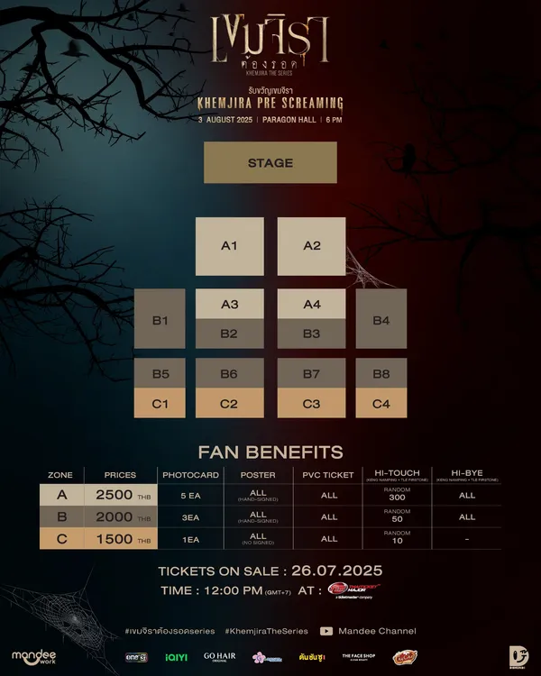 โดยบัตรจะเปิดจำหน่ายผ่านทางไทยทิกเก็ตเมเจอร์ ในวันที่ 26 กรกฎาคม 2025 นี้ เวลา 12.00 น. เป็นต้นไป บัตรราคา 2,500 / 2,000 / 1,500 บาท พร้อมกับมาสัมผัสความหลอนก่อนใคร เชื่อว่าแฟนซีรีส์จะต้องกดจองกันแบบรัวๆ ยิ่งไปกว่านั้นในงานแถลงข่าวรอบปฐมทัศน์ “รับขวัญเขมจิรา: KHEMJIRA HOMECOMING Press Conference” วันอาทิตย์ที่ 3 สิงหาคม 2025 ณ พารากอน ฮอลล์ ชั้น 5 สยามพารากอน หากมีความคืบหน้าของซีรีส์เรื่องนี้ไม่พลาดนำมาอัปเดทให้ได้ติดตามกันต่ออย่างแน่นอน