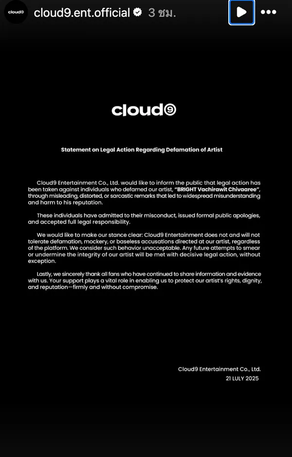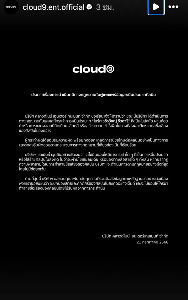 บริษัทฯ ขอเน้นย้ำจุดยืนอย่างชัดเจนว่า จะไม่ยินยอมให้มีการกระทำใด ๆ ที่เป็นการหมิ่นประมาทหรือใส่ร้ายศิลปินในสังกัด ไม่ว่าจะผ่านโซเชียลมีเดีย หรือช่องทางสื่อสารใดๆ ทั้งสิ้น หากปรากฏความพยายามใดในการทำลายชื่อเสียงของศิลปิน บริษัทฯ จะดำเนินการตามกฎหมายอย่างถึงที่สุดโดยไม่มีข้อยกเว้น ท้ายที่สุดนี้ บริษัทฯ ขอขอบคุณแฟนคลับทุกท่านที่ร่วมมือส่งข้อมูลและหลักฐานมาอย่างต่อเนื่อง พวกเราขอยืนยันว่า จะปกป้องสิทธิและศักดิ์ศรีของศิลปินในสังกัดอย่างเต็มที่ และจะไม่ยอมให้ใครมาทำลายชื่อเสียงของศิลปินโดยไม่รับผลจากการกระทำนั้น บริษัท คลาวด์ไนน์เอนเตอร์เทนเมนท์ จำกัด”