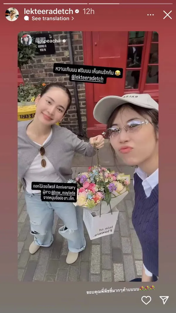 แต่เนื่องในโอกาสพิเศษวันครบรอบทั้งทีหนุ่ม อาเล็ก ธีรเดช ก็ไม่ลืมจะเสิร์ฟความหวานให้แฟนสุดที่รัก แบบไม่แคร์ระยะทาง ส่งดอกไม้สุดน่ารักไปให้ถึงมือสาว โบว์ เมลดา ที่ประเทศอังกฤษ โดยที่งานี้ได้อินฟลูเอนเซอร์คนดังอย่าง พีชชี่ พิชญา ชัยชนะ หรือ "พีชชี่ สตีเฟ่นโอปป้า" ช่วยเป็นสะพานรักให้