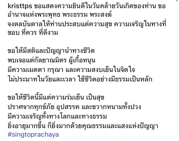 "ขอแสดงความยินดีในวันคล้ายวันเกิดของท่าน ขออำนาจแห่งพระพุทธ พระธรรม พระสงฆ์ จงดลบันดาลให้ท่านประสบแต่ความสุข ความเจริญในทางที่ชอบ ที่ควร ที่ดีงาม ขอให้มีสติและปัญญานำทางชีวิต พบเจอแต่กัลยาณมิตร ผู้เกื้อหนุน มีความเมตตา กรุณา และความสงบเย็นในจิตใจ ไม่ประมาทในวัยและเวลา ใช้ชีวิตอย่างมีธรรมเป็นหลัก ขอให้ชีวิตนี้มีแต่ความร่มเย็น เป็นสุข ปราศจากทุกข์ภัย อุปสรรค และขวากหนามทั้งปวง มีความเจริญทั้งทางโลกและทางธรรมยิ่งอายุมากขึ้น ก็ยิ่งมากด้วยคุณธรรมและแสงแห่งปัญญา #singtoprachaya"