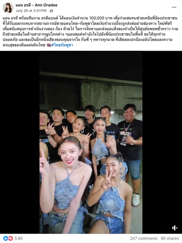 "แอน อรดี พร้อมทีมงาน อรดีแบนด์ ได้มอบเงินจำนวน 100,000 บาท เพื่อร่วมสมทบช่วยเหลือพี่น้องประชาชนที่ได้รับผลกระทบจากสถานการณ์ชายแดนไทย–กัมพูชาโดยเงินจำนวนนี้จะถูกส่งต่อผ่านช่องทาง ใหม่พัชรี เพื่อสนับสนุนการดำเนินงานของ ก้อง ห้วยไร่ ในการจัดหาและส่งมอบสิ่งของจำเป็นให้ศูนย์อพยพชั่วคราว รวมถึงช่วยเหลือในด้านสาธารณูปโภคต่าง ๆแอนขอส่งกำลังใจไปยังพี่น้องประชาชนในพื้นที่ ขอให้ทุกท่านปลอดภัย และขอเป็นอีกหนึ่งเสียงขอบคุณจากใจ กับพี่ ๆ ทหารทุกนาย ที่เสียสละปกป้องอธิปไตยและความสงบสุขของผืนแผ่นดินไทย #ไทยกัมพูชา"