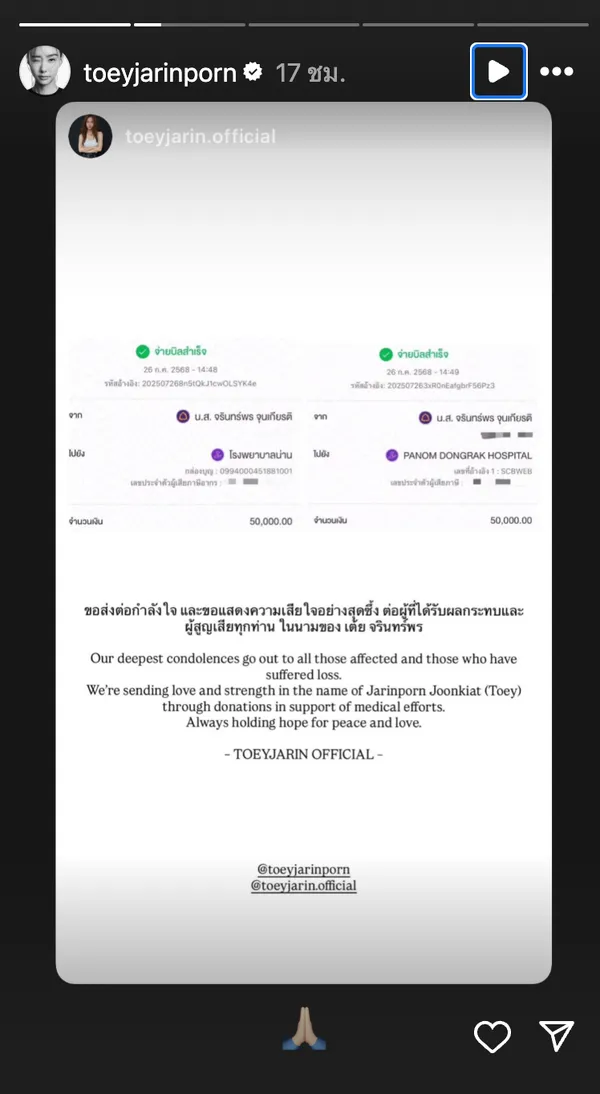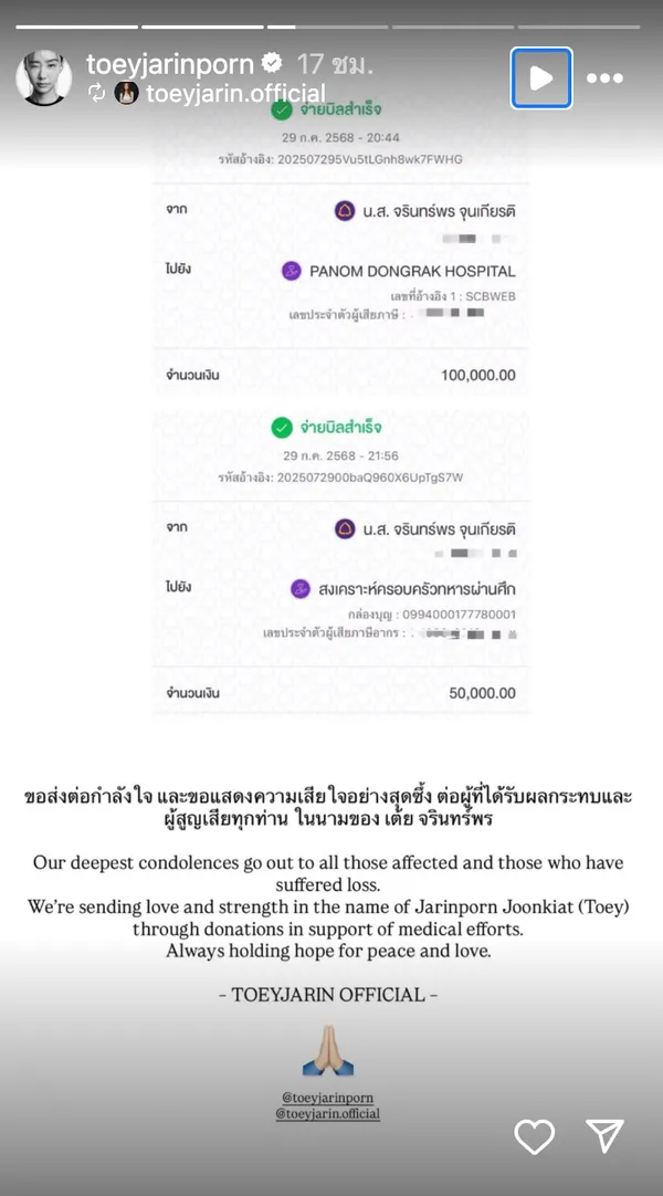 "ขอส่งต่อกำลังใจ และขอแสดงความเสียใจอย่างสุดซึ้ง ต่อผู้ที่ได้รับผลกระทบและ ผู้สูญเสียทุกท่าน ในนามของ เต้ย จรินทร์พร เราขอแสดงความเสียใจอย่างสุดซึ้งต่อผู้ที่ได้รับผลกระทบและผู้ที่สูญเสียทุกคน เราส่งความรักและความเข้มแข็งในนามของ จรินทร์พร จุนเกียรติ (เต้ย) ผ่านการบริจาคเพื่อสนับสนุนการรักษาพยาบาล หวังให้มีสันติสุขและความรักเสมอ"