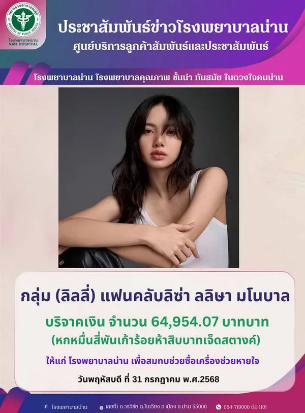 ชาวเน็ตชื่นชม ลิลลี่ กลุ่มแฟนคลับของ ลิซ่า ลลิษา หรือ LISA BLACKPINK นักร้องสาวชื่อดัง แสดงพลังร่วมกัน บริจาคเงินเงินกว่า 6.4 หมื่นบาทแก่ โรงพยาบาลน่าน ในสถานการณ์ภัยพิบัติ น้ำท่วมน่าน