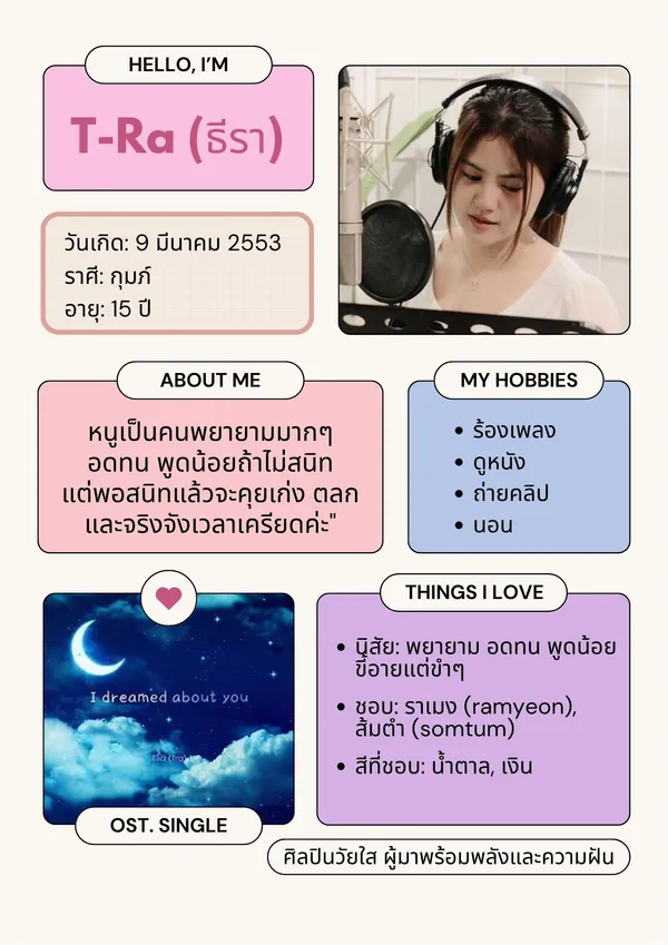 ด้วยความที่ “ธีรา-นพธีรา กุญแจทอง” (T-RA) เป็นเด็กกิจกรรมตัวจริงเสียงจริง ชื่นชอบในการร้อง และเต้น บวกกับครอบครัวสนับสนุน ทำให้ “ธีรา” เดินทางสายนี้ด้วยความมั่นใจ ก่อนหน้านี้มีไปลงเรียนทักษะเพิ่มเติม ได้เข้าแข่งขัน และโชว์ตัวอยู่บ่อยครั้ง จนได้มีโอกาสเป็นเด็กฝึกที่ค่ายในเมืองไทยก่อนจะส่งไปเทรนด์ต่อที่ประเทศเกาหลีใต้ “ธีรา” เล่าประสบการณ์เป็นเด็กฝึก และที่มาของการได้มาร้องเพลงประกอบซีรีส์ให้ฟังว่า