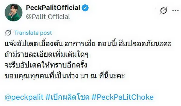 ล่าสุดที่บัญชีเอ็กซ์(ทวิตเตอร์) PeckPalit Official ได้มีการโพสต์ข้อความว่า "แจ้งอัปเดตเบื้องต้น อาการเฮีย ตอนนี้เฮียปลอดภัยนะคะ ถ้ามีรายละเอียดเพิ่มเติมใดๆ จะรีบอัปเดตให้ทราบอีกครั้ง ขอบคุณทุกคนที่เป็นห่วง มา ณ ที่นี้นะคะ"