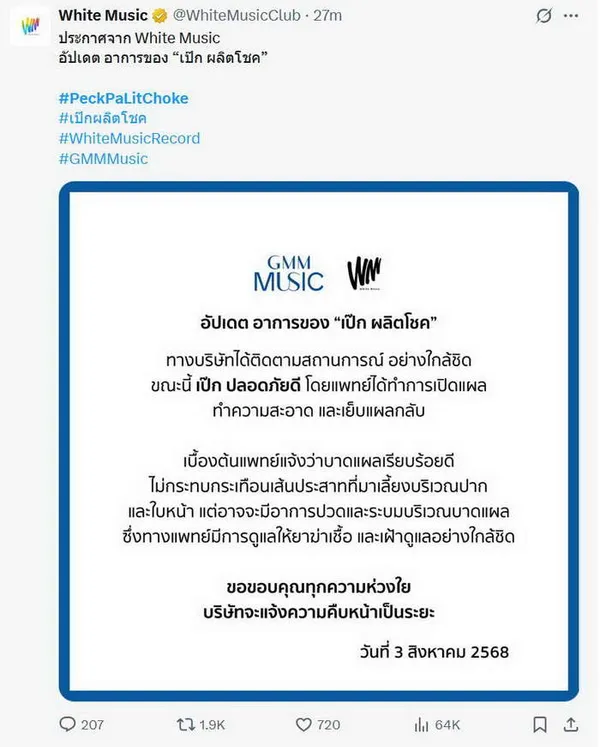 และในเวลาต่อมาบัญชีเอ็กซ์ WhiteMusicClub ซึ่งเป็นต้นสังกัดของ เป๊ก ผลิตโชค ได้โพสต์ข้อความว่า " อัปเดตอาการของ เป๊ก ผลิตโชค ทางบริษัทได้ติดตามสถานการณ์ อย่างใกล้ชิด ขณะนี้ "เป๊ก ปลอดภัยดี" โดยแพทย์ได้ทำการเปิดแผล ทำความสะอาด และเย็บแผลกลับ