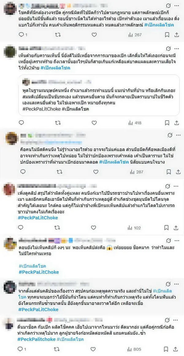 - เพิ่งดูคลิป สรุปได้ว่าผิดทั้งคู่แหละ คนนึงก็เมาไปปีนรถชาวบ้าน ไปหาเรื่องคนอื่นเพราะเมา และอีกคนคือเอามีดไปฟัน ก็ทำเกินกว่าเหตุอยู่ดี ถ้าเกิดช่วงชุลมุนมีดไปโดนจุดสำคัญได้เลยนะ ใกล้คอ แต่ก็ไม่เข้าข้างพี่เป๊กนะ เห็นคลิปแล้วถ้าแกไม่โดดไปเกาะรถ ชาวบ้านคงไม่เกิดเรื่องอะ