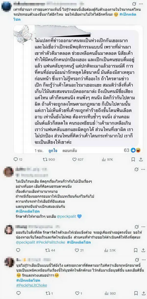 - เคยติดตามและพอจะรู้เรื่องราวของเป็กมาบ้าง เขาโดนอะไรมาเยอะมากนะ กว่าเขาจะผ่านมันมาได้อยู่จุดนี้ เขาเป็นคนน่ารักมากนะ ทัศนคติมีแต่ด้านบวก แอบห่วงว่าเหตุการณ์นี้มันจะทำให้เขาเป็นยังไงบ้าง เป็นกำลังใจให้นุชนะคะ ผิดถูกก็ว่าไปตามกระบวนการ