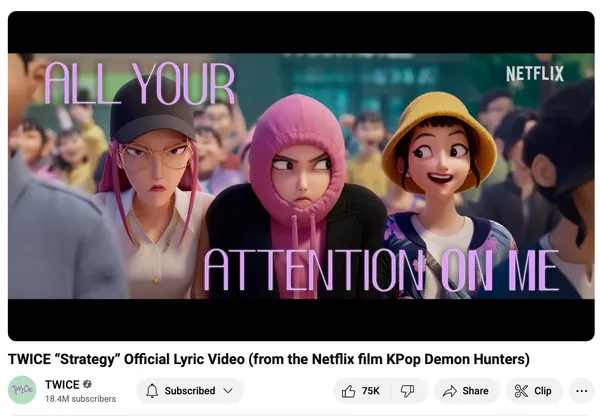 Strategy เป็นอีกหนึ่งผลงานเพลงคุณภาพของ TWICE ซึ่งเป็นซิงเกิลจากมินิอัลบั้ม Strategy ปล่อยออกมาครั้งแรกเมื่อเดือนธันวาคม 2024 Strategy ถูกเปิดในช่วงหนึ่งของแอนิเมชั่น แม้จะถูกเปิดแค่ประมาณ 30 วินาทีแต่ก็สร้างปรากฎการณ์พาเพลงที่ปล่อยมาแล้ว 6 เดือนติด Spotify Global รวมถึงเพลงยังได้ถูกรวมอยู่ในอัลบั้มเพลงประกอบภาพยนตร์ KPop Demon Hunters ด้วย
