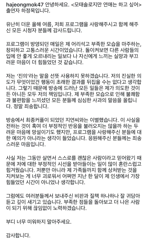 จองมก หนึ่งในผู้เข้าร่วมรายการเรียลลิตี้ Better Late Than Single ได้ออกมาเปิดเผยความสัมพันธ์ล่าสุดว่าเขาและ จียอน ซึ่งเคยเป็นคู่รักที่เกิดจากรายการว่าตอนนี้ได้เลิกรากันเป็นที่เรียบร้อยแล้ว พร้อมทั้งกล่าวขอโทษต่อพฤติกรรมที่ก่อให้เกิดความไม่สบายใจในช่วงที่รายการออกอากาศ