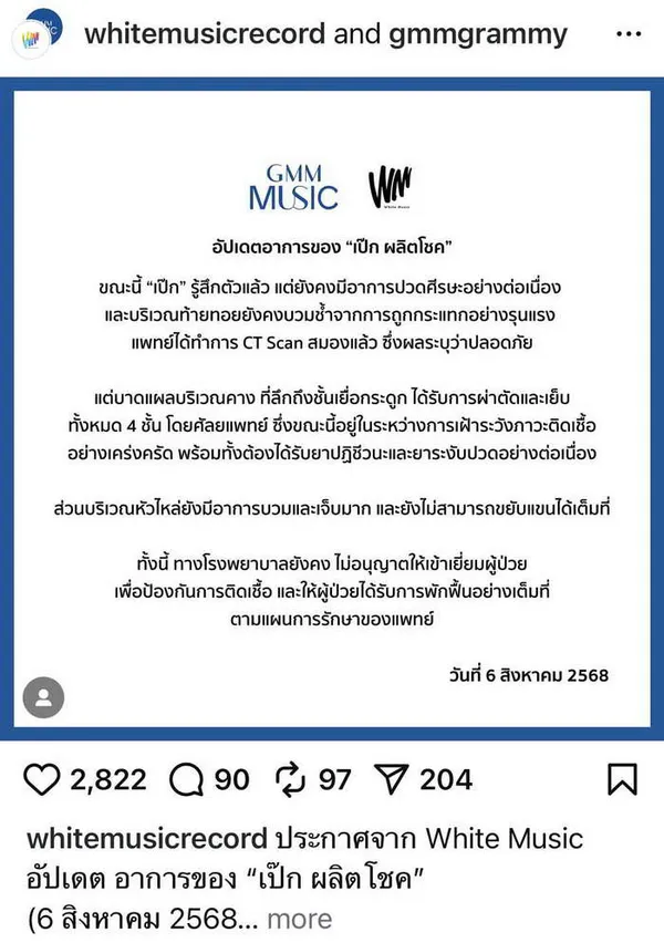 White Music ต้นสังกัด เป๊ก ผลิตโชค เผยอาการล่าสุด นักร้องหนุ่มรู้สึกตัวแล้ว ผล CT Scan สมองไม่มีอะไรผิดปกติ แต่ยังมีอาการปวดศีรษะและบาดแผลหลังการผ่าตัด แพทย์ยังไม่อนุญาติให้เข้าเยี่ยม ต้องเฝ้าระวังภาวะติดเชื้ออย่างเคร่งครัด